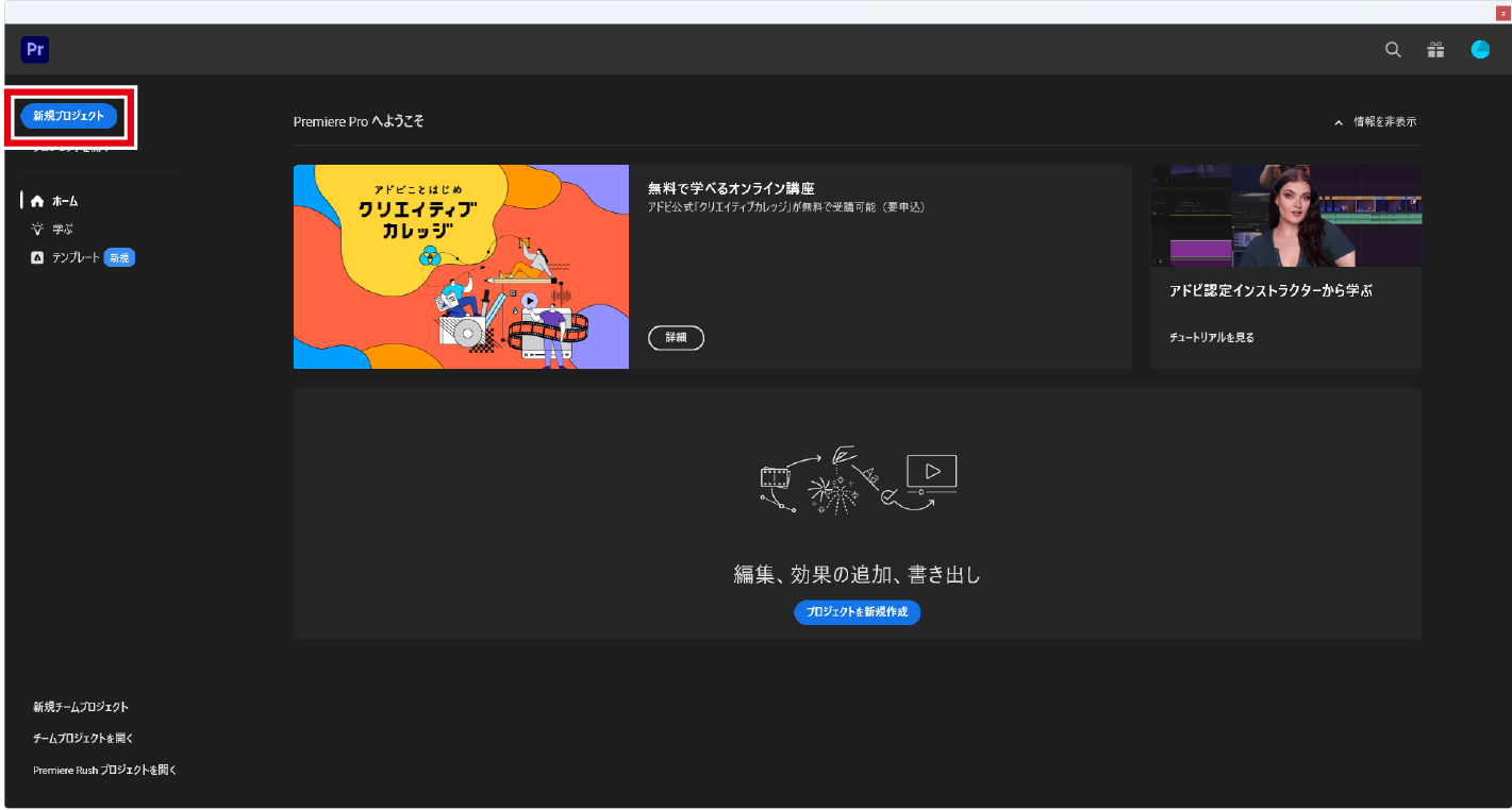 | 3 | Premiere Proを起動して新規プロジェクトを作成する | - |