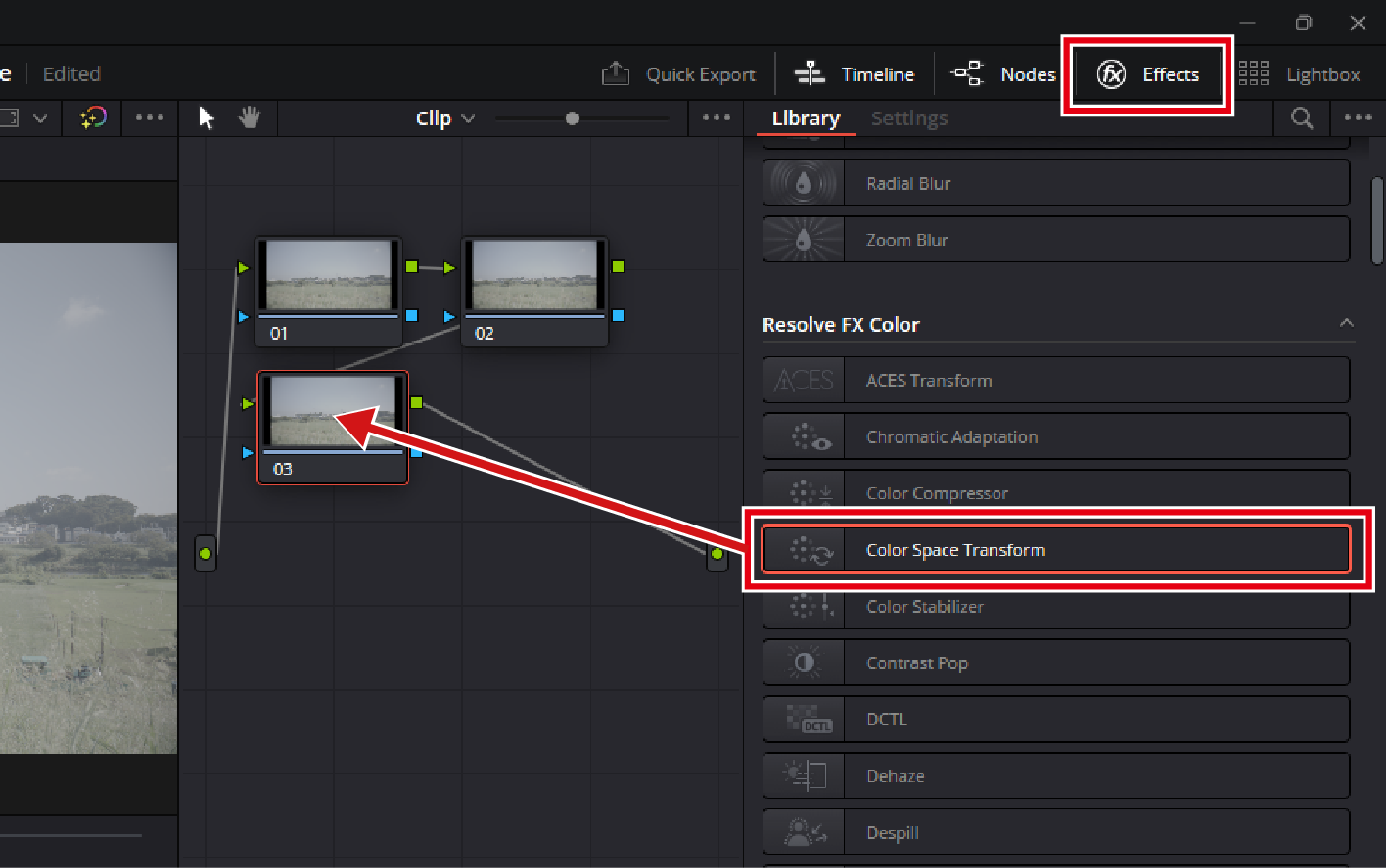 Select [Effects], then [Color Space Transform] and drag it into the last node.