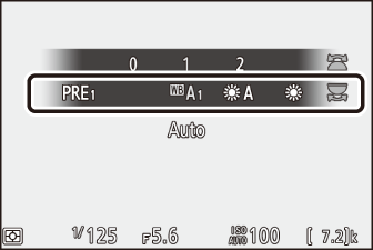Ve výchozím nastavení lze vyvážení bílé zvolit také přidržením tlačítka Fn1 a otáčením hlavního příkazového voliče ( tlačítka Fn1 a Fn2 ).