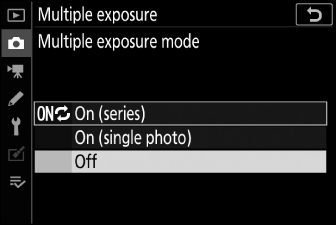 Chcete-li ukončit vícenásobnou expozici před pořízením zadaného počtu expozic, vyberte pro režim vícenásobné expozice [ ]. Vícenásobná expozice bude vytvořena z expozic, které byly do tohoto bodu zaznamenány (pokud je pro [ ] zvoleno [ ], zisk bude upraven tak, aby odrážel počet skutečně zaznamenaných expozic).