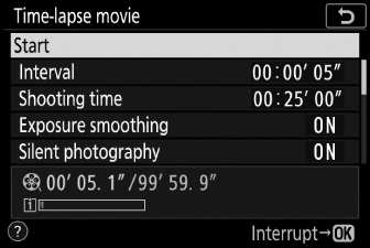 Spusťte časosběrné nahrávání. Fotografování začne přibližně po 3 s a pokračuje v intervalu zvoleném pro [ ] po dobu zvolenou pro [ ]. |