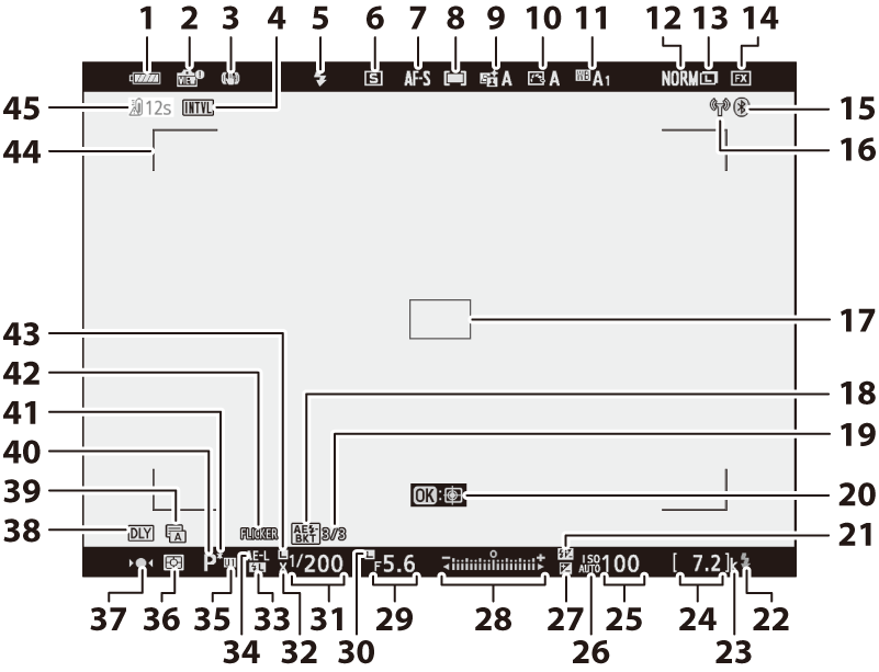 Indikátor expozice a zábleskového bracketingu ( expoziční a zábleskový bracketing ) Indikátor vyvážení bílé (WB bracketing) Indikátor bracketingu ADL ( ADL Bracketing ) Indikátor HDR ( pořizování HDR fotografií ) Indikátor vícenásobné expozice ( vytvoření vícenásobné expozice ) |