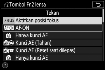 Menahan tombol Fn2 lensa akan mengaktifkan fokus manual, dan kamera tidak akan memfokus ulang jika tombol pelepas rana ditekan separuh saat kontrol ditekan.