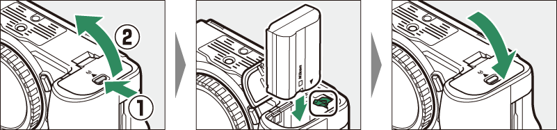 Ak chcete vybrať batériu, vypnite fotoaparát a otvorte kryt priestoru pre batériu. Stlačením západky batérie v smere šípky uvoľnite batériu a potom ju vyberte rukou.
