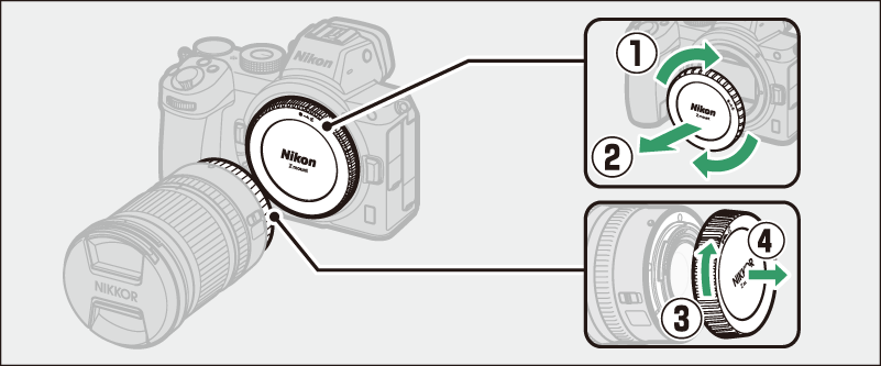 Po vypnutí fotoaparátu stlačte a podržte tlačidlo uvoľnenia objektívu ( q ) a súčasne otáčajte objektívom v zobrazenom smere ( w ).