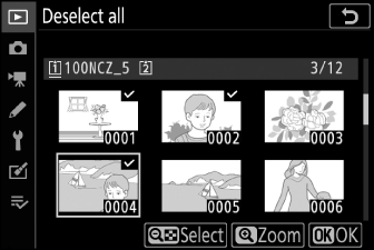 Zvýraznite obrázky a stlačením tlačidla W ( Q ) vyberte; vybrané obrázky sú označené písmenom L Ak chcete zrušiť výber aktuálneho obrázka, znova stlačte tlačidlo W ( Q ); L sa už nebude zobrazovať.