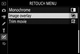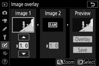 Prekrytie obrázkov kombinuje existujúce fotografie a vytvára jeden obrázok, ktorý sa uloží oddelene od originálov. Jeden obrázok NEF ( RAW ) je možné prekryť druhým pomocou aditívneho miešania ([ ]), alebo je možné spojiť viacero obrázkov pomocou [ ] alebo [ ].