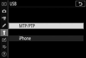 - Ta možnost deluje izključno za omogočanje povezave z iPhoni, na katerih je nameščena aplikacija NX MobileAir . Izberite [ MTP/PTP ], če ne uporabljate NX MobileAir .