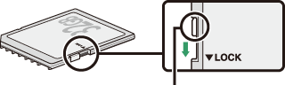 Paměťové karty SD jsou vybaveny přepínačem ochrany proti zápisu, který zabraňuje náhodné ztrátě dat. Když je tento přepínač v poloze „lock“, nelze naformátovat paměťovou kartu a nelze mazat ani zaznamenávat fotografie (při pokusu o spuštění závěrky se na monitoru zobrazí varování). Chcete-li paměťovou kartu odemknout, posuňte přepínač do polohy „zápis“.