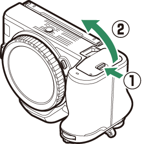 Chcete-li vyjmout baterii, vypněte fotoaparát a otevřete krytku prostoru pro baterii. Stisknutím západky baterie ve směru šipky uvolněte baterii a poté ji rukou vyjměte.