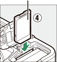 Po potvrzení, že kontrolka přístupu na paměťovou kartu nesvítí, vypněte fotoaparát, otevřete krytku prostoru pro baterii a zatlačením na kartu ji vysuňte ( q ). Kartu lze poté vyjmout rukou ( w ).