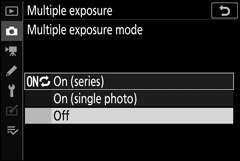 - Režim vícenásobné expozice : Vyberte z možností Zapnuto (série) (pořízení série vícenásobných expozic, které končí, když je vybráno Vypnuto ), Zapnuto (jedna fotografie) (pořízení jedné vícenásobné expozice) nebo Vypnuto (ukončení bez vytvoření dalších vícenásobných expozic).