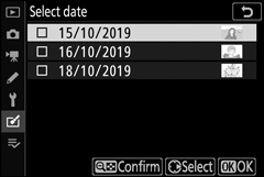 Pokud v kroku 2 vyberete možnost Vybrat datum , zobrazí se seznam dat. Zvýrazněte data pomocí multifunkčního voliče a stisknutím 2 vyberte nebo zrušte výběr. Stisknutím tlačítka J vyberte všechny snímky NEF ( RAW ) pořízené ve zvolený den a přejděte ke kroku 4.
