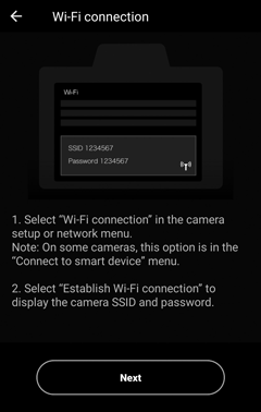 Zadejte SSID a heslo zobrazené fotoaparátem v kroku 4.