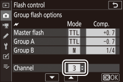 Na displeji ovládání blesku zvýrazněte možnosti skupinového blesku a stiskněte 2 .