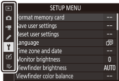 Klepnite na požadovanú položku alebo zvýraznite položky a stlačením J zobrazte možnosti. Nastavenia môžete upraviť aj zvýraznením položiek a otáčaním príkazových voličov. Položky zobrazené v režime fotografie sa líšia od položiek zobrazených v režime videozáznamu.