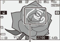 Ak je zvýraznenie zaostrenia povolené pomocou užívateľského nastavenia d9 ( Peaking highlights ), objekty, ktoré sú zaostrené, budú v režime manuálneho zaostrovania označené farebnými obrysmi. Upozorňujeme, že vrcholy sa nemusia zobraziť, ak fotoaparát nedokáže rozpoznať obrysy. V takom prípade možno zaostrenie skontrolovať pomocou pohľadu cez objektív na displeji.