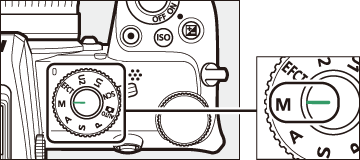 V manuálnom expozičnom režime ovládate rýchlosť uzávierky aj clonu. Otáčaním hlavného príkazového voliča vyberte rýchlosť uzávierky a pomocným príkazovým voličom nastavte clonu. Rýchlosť uzávierky je možné nastaviť na hodnoty medzi 30 s a 1/4000 s alebo je možné ponechať uzávierku otvorenú na neurčito pre dlhú expozíciu ( 0 Dlhodobé expozície ). Clonu možno nastaviť na hodnoty medzi minimálnou a maximálnou hodnotou pre objektív. Na kontrolu expozície použite indikátory expozície.