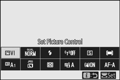 Nastavenia pre zvýraznené položky môžete upraviť aj otočením hlavného príkazového voliča, aby ste vybrali možnosť, a potom stlačením J (vedľajšie možnosti, ak sú dostupné, je možné vybrať otáčaním pomocného príkazového voliča; v niektorých prípadoch môžu byť rovnaké možnosti zvolený pomocou ľubovoľného voliča). Aktuálna možnosť sa vyberie aj vtedy, ak pomocou multifunkčného voliča zvýrazníte inú položku alebo stlačíte tlačidlo spúšte do polovice.