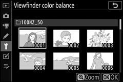 Zvýšte jantárovú farbu Zvýšte purpurovú - Vyváženie farieb v hľadáčiku sa vzťahuje len na ponuku, prehrávanie a zobrazenia pri snímaní; obrázky nasnímané fotoaparátom nie sú ovplyvnené.