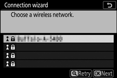 Zvýraznite Search for Wi-Fi network a stlačte J . Kamera vyhľadá aktuálne aktívne siete v okolí a zobrazí ich zoznam podľa názvu (SSID).