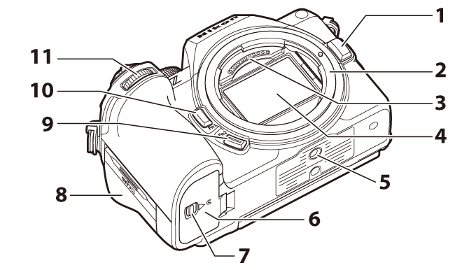 - Tilbehørssko (til valgfri flashenhed; 0 Brug af blitz på kameraet , kompatible flashenheder )