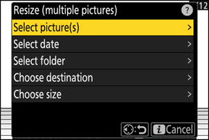 Vælg [ Retouchering ] i menuen i , fremhæv derefter [ Skift størrelse (flere billeder) ], og tryk på 2 .