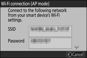 Camera: Select [Connect to smart device] > [Wi-Fi connection (AP mode)] in the network menu, then highlight [Establish Wi-Fi connection] and press J.