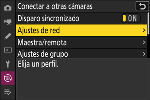 Seleccione [Conectar a otras cámaras] en el menú de red, luego marque [Ajustes de red] y pulse 2.