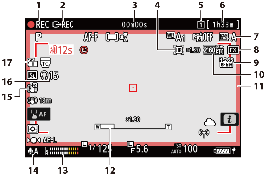 - Indicateur d’enregistrement (cadre rouge ; 0 g19 : Cadre REC rouge)
