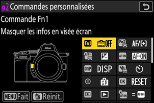 Vous pouvez redonner aux commandes sélectionnées leurs réglages par défaut via l’écran de sélection des commandes personnalisées. Vous pouvez réinitialiser les commandes individuellement ou toutes les commandes. Pour obtenir des informations sur la réinitialisation des commandes personnalisées, reportez-vous à « Rétablissement des réglages par défaut » dans la section « f2 : Commandes perso (prise de vue) » (0 Rétablissement des réglages par défaut).
