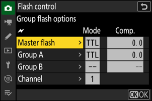 - Selezionare la modalità di controllo del flash e il livello del flash per il flash master e le unità flash remote in ciascun gruppo.