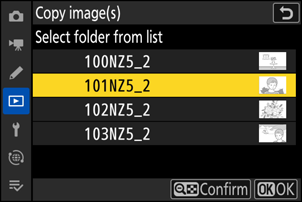 Dopo aver immesso un numero di cartella o evidenziato il nome della cartella, premere J per selezionare la cartella e tornare al menu [ Copia foto ].