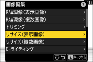 iメニューの[画像編集]で[リサイズ(表示画像)]を選んで2を押す