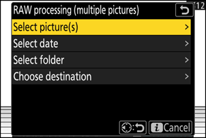 Опция Сипаттама [ Select picture(s) ] Таңдалған NEF ( RAW ) суреттерінің HEIF көшірмелерін жасаңыз. Бірнеше NEF ( RAW ) суреттерін таңдауға болады. [ Select date ] Таңдалған күндерде түсірілген барлық NEF ( RAW ) суреттерінің HEIF көшірмелерін жасаңыз. [ Select folder ] Таңдалған қалтадағы барлық NEF ( RAW ) суреттерінің HEIF көшірмелерін жасаңыз. [ Choose destination ] HEIF көшірмелері үшін тағайындалған орынды таңдаңыз. Тек бір жад картасы салынған болса, ұяны таңдау сұралмайды. [ Select picture(s) ] таңдасаңыз, 5-қадамға өтіңіз.