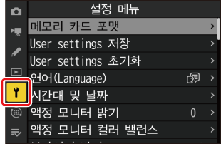 설정 메뉴에는 다음 항목이 포함되어 있습니다.