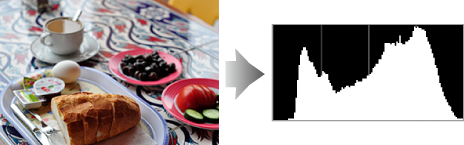 Histogramos rodo tonų pasiskirstymą. Pikselių ryškumas (tonas) vaizduojamas horizontalioje ašyje, o pikselių skaičius – vertikalioje ašyje.