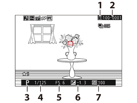 Peržiūrėkite nustatymus, galiojusius nuotraukos darymo metu. Fotografavimo duomenų sąrašą sudaro keli puslapiai, kuriuos galima peržiūrėti paspaudus 1 arba 3 . Rodomą informaciją galima pasirinkti naudojant [ Playback display options ] > [ Detailed shooting data ] atkūrimo meniu.