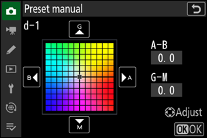 Pasirinkę spalvų temperatūrą, paspauskite mygtuką W ( Q ), kad būtų rodomos tikslaus derinimo parinktys. Naudokite kryptinį valdiklį, kad nustatytumėte žymeklį tinklelyje.