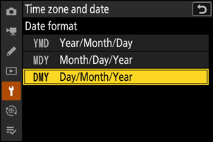 - Displejā [ Time zone and date ] atlasiet [ Date format ].