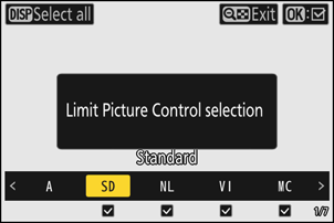 - Het beperken van de selectie Picture Control is niet van toepassing op de Picture Controls die worden weergegeven in de items [ Picture Control instellen ] in de menu's voor foto-opnamen en video-opnamen.