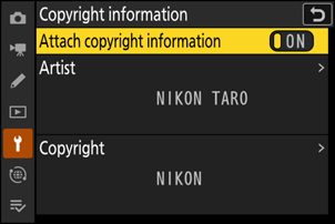 Legg til opphavsrettsinformasjon til nye bilder etter hvert som de blir tatt. Opphavsrettsinformasjon kan vises i NX Studio [ Info ]-fanen.