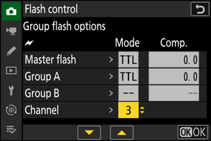 - Wybierz tryb sterowania lampą błyskową oraz moc błysku dla głównej lampy błyskowej oraz lamp zdalnych w każdej grupie.