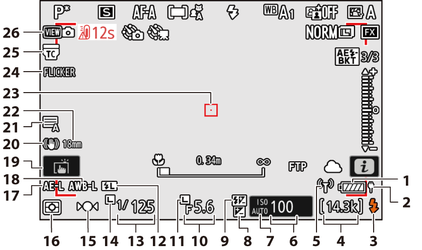 - Indikator izostrenosti (AF s samodejnim območjem; 0 fotografiranje (način b ) )