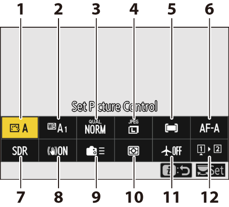 Притиском на дугме i у режиму фотографије приказују се доле наведене ставке. Означите жељену ставку помоћу џојстика и притисните J да видите опције.