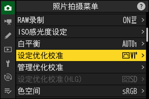选择照片拍摄菜单或视频拍摄菜单中的[设定优化校准],或者照片拍摄菜单中的[设定优化校准(HLG)],然后加亮显示所需的优化校准并按下2。