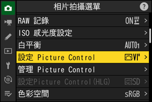 選擇相片拍攝選單或短片記錄選單中的 [設定 Picture Control],或者相片拍攝選單中的 [設定Picture Control(HLG)],然後反白顯示所需的 Picture Control 並按下 2。