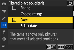 - Markeer [ Datum selecteren ] en druk op 2 om een datum te selecteren als gefilterde afspeelcriteria.