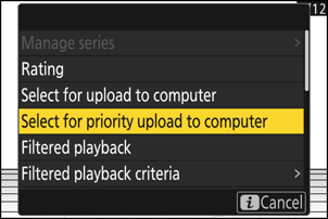 - Aby oznaczyć bieżące zdjęcie do s przesłania i natychmiast rozpocząć przesyłanie, naciśnij przycisk i , zaznacz opcję [ Wybierz do priorytetowego przesłania na komputer ] lub [ Wybierz do priorytetowego przesłania ( FTP ) ] i naciśnij przycisk J Zdjęcia oznaczone do priorytetowego przesłania zostaną przesłane przed zdjęciami oznaczonymi do przesłania w inny sposób.