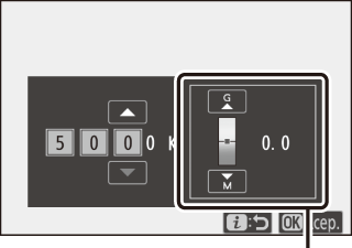 Toque las flechas en la pantalla o utilice el multiselector para ajustar con precisión el balance de blancos, o gire el dial de control principal o secundario para ajustar con precisión el balance de blancos respectivamente en los ejes Ámbar–Azul o Verde–Magenta. Pulse J para guardar los ajustes y volver al menú i.